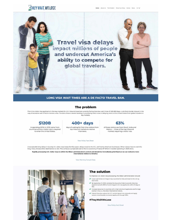 This website was created on behalf of the U.S. Travel Association. It now serves as the online forum for its “They Wait, We Lose” advocacy effort to reduce excessive wait times for international visitor visas. The site allows potential travelers from around the world experiencing extreme wait times to share testimonials about how visitor visa delays are preventing them from seeing loved ones, attending important events and hurting their businesses. It also provides an outlet for U.S. business owners to raise awareness of the severe impact on the nation’s travel sector. I provided creative direction for the complete “They Wait We Lose” concept. This has won 7 Vega Awards.